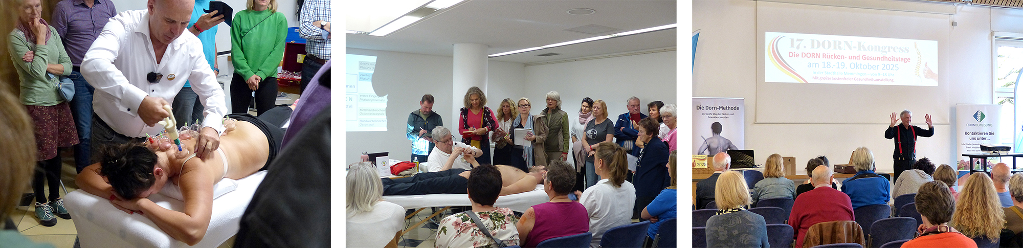 Die Behandlungsdemonstrationen sind ein fester Bestandteil des DORN-Kongresses. Hier wird gezeigt, wie die DORN-Anwendung funktioniert und auch praktiziert. Es ist eine gute Gelegenheit, die DORN-Anwendung kennenzulernen. Zudem kann sich jeder für eine kleine Spende Probebehandeln lassen.