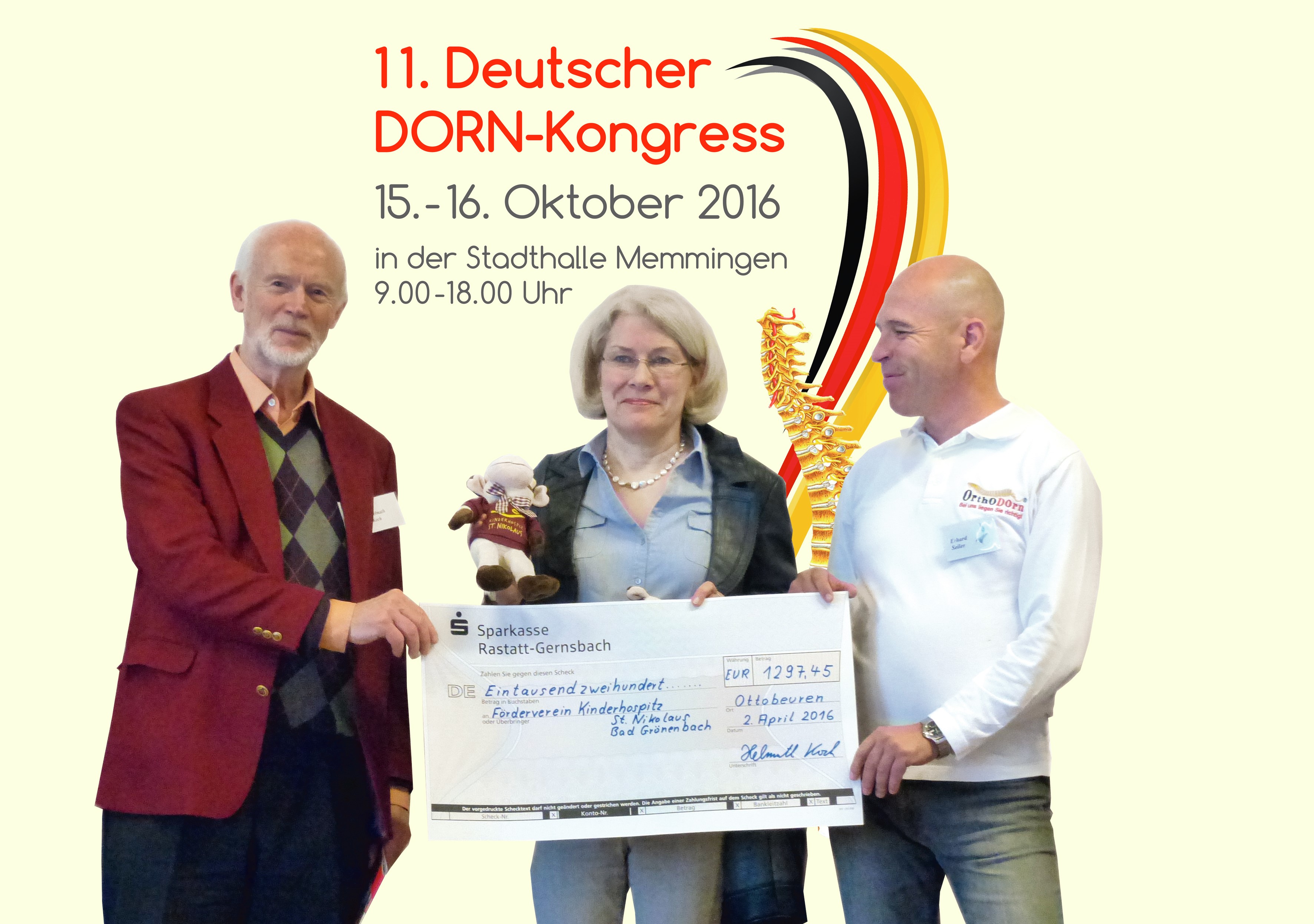 Wie jedes Jahr konnten sich alle Gäste des 10. DORN-Kongresses 2015 nach DORN behandelnlassen. Lediglich eine 5,- Euro Spende war dafür nötig. Beim großen DORN-Anwender-Treffen am 2. April 2016 in Ottobeuren wurden nun vom Veranstalter des DORN-Kongresses - Erhard Seiler von der Gesund Media GmbH - und dem 1. Vorsitzenden der Deut