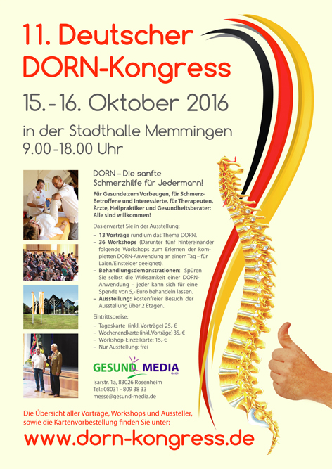 Auch Sie können den DORN-Kongress auf einfache Art und Weise unterstützen. Gerne senden wir Ihnen Werbematerialien wie Programmhefte, Flyer, Banner oder Aufkleber zu. Diese können Sie auslegen, verteilen oder verschicken. Umgekehrt hinterlassen die Werbemaßnahmen einen seriösen und professionellen Eindruck bei Ihren Patienten und Kunden. Natürlich erhalten Sie die Werbemittel kostenfrei von der Gesund Media GmbH.