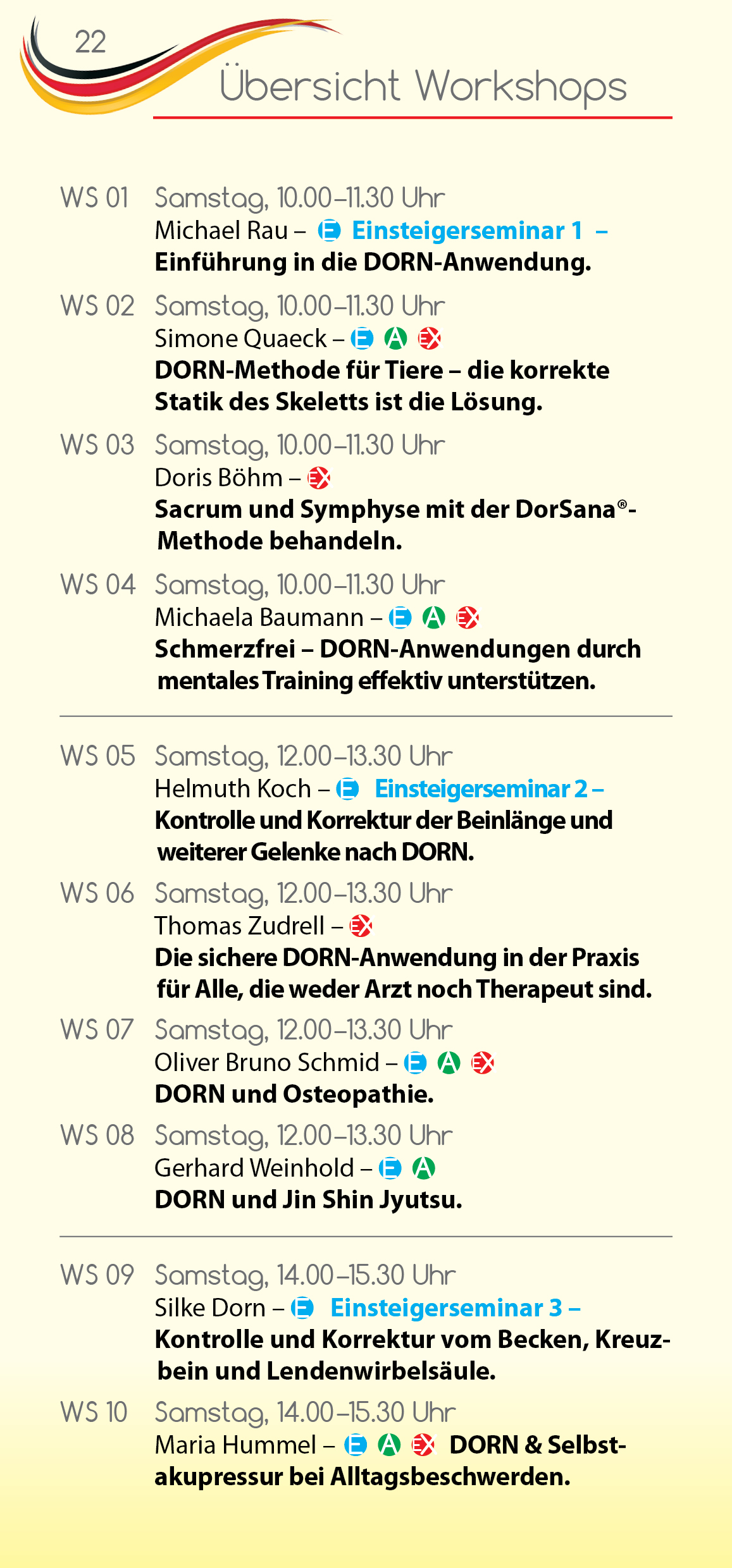 Für Interessierte, Anfänger und Einsteiger zur Einführung – für Fortgeschrittene zur Wiederholung: Im Workshop wird die geschichtliche Entwicklung der Behandlung von Wirbelsäulenproblemen, bis hin zur DORN-Anwendung aufgezeigt. Anwendungsgebiete, Ausblicke und Grenzen des Verfahrens und eine Einführung in die Vorgehensweise mit praktischer Demonstration für alle Teilnehmer. Jeder kann hier aktiv mitarbeiten und praktisch lernen.