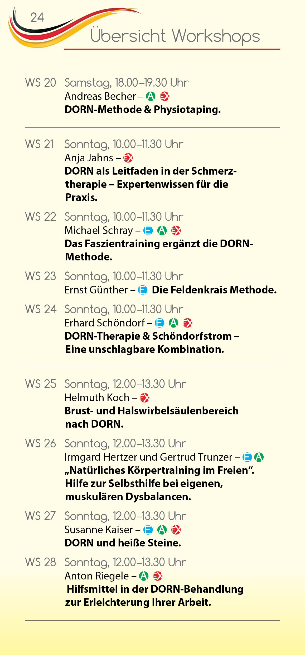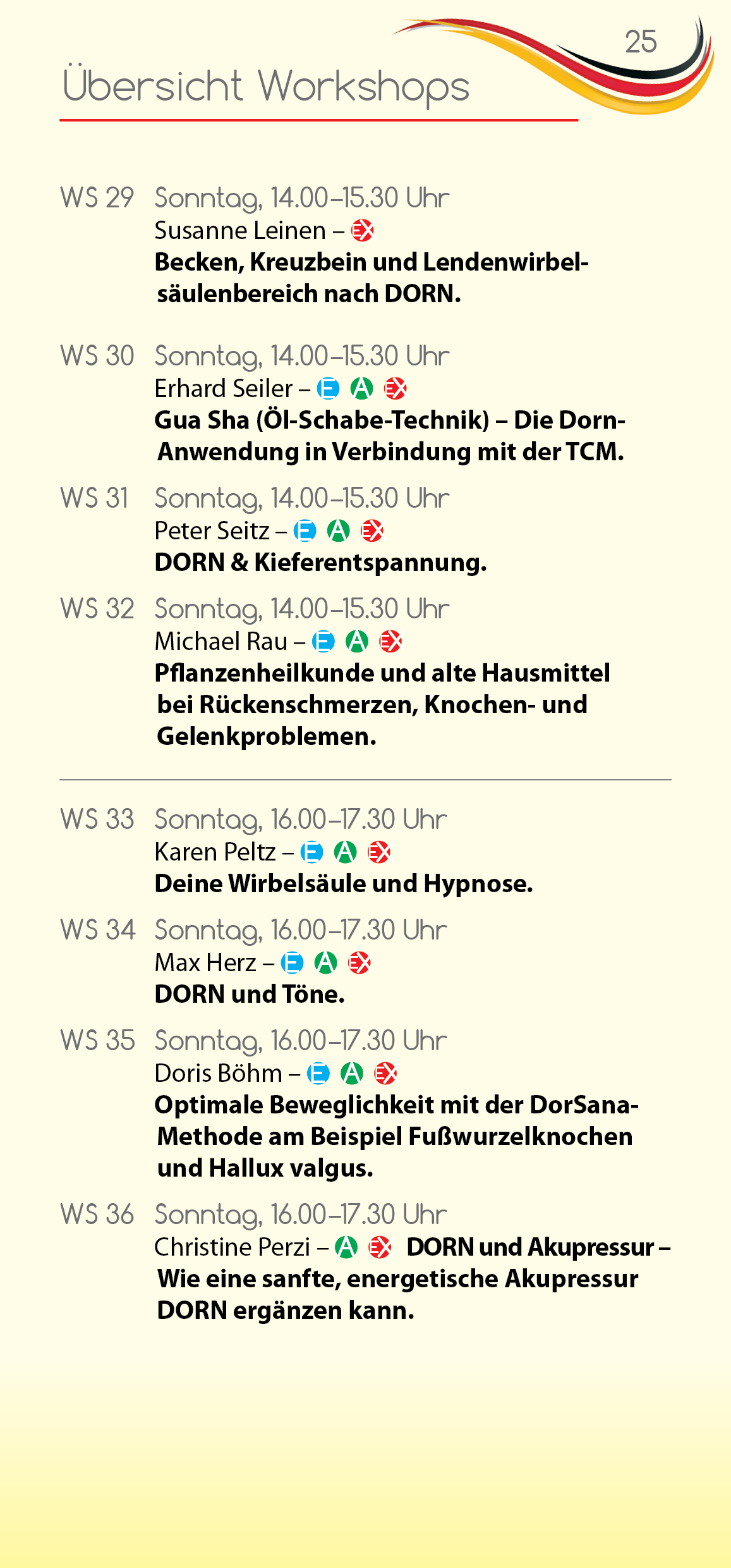 Der Profiworkshop ist für Anwender im therapeutischen Bereich, die DORN neben Osteopathie und anderen Methoden in der Schmerztherapie anwenden. Der Schwerpunkt im Workshop liegt auf dem Kennenlernen und Einüben von Behandlungsstrategien im Methodenmix von DORN mit Faszienarbeit (Rollen), Schröpfen, Reflexzonentherapie, Mobilisation über Deuser-Akupressur und v.a.. Es wird am Anfang das theoretische Gerüst besprochen, wo DORN als Leitfaden genommen wird und dann im Einzelsetting an Beispielen und in der Gruppenarbeit die einzelnen Körperzonen gegen Schmerz mit den sinnvoll kombinierbaren anderen Ansätzen mobilisiert.