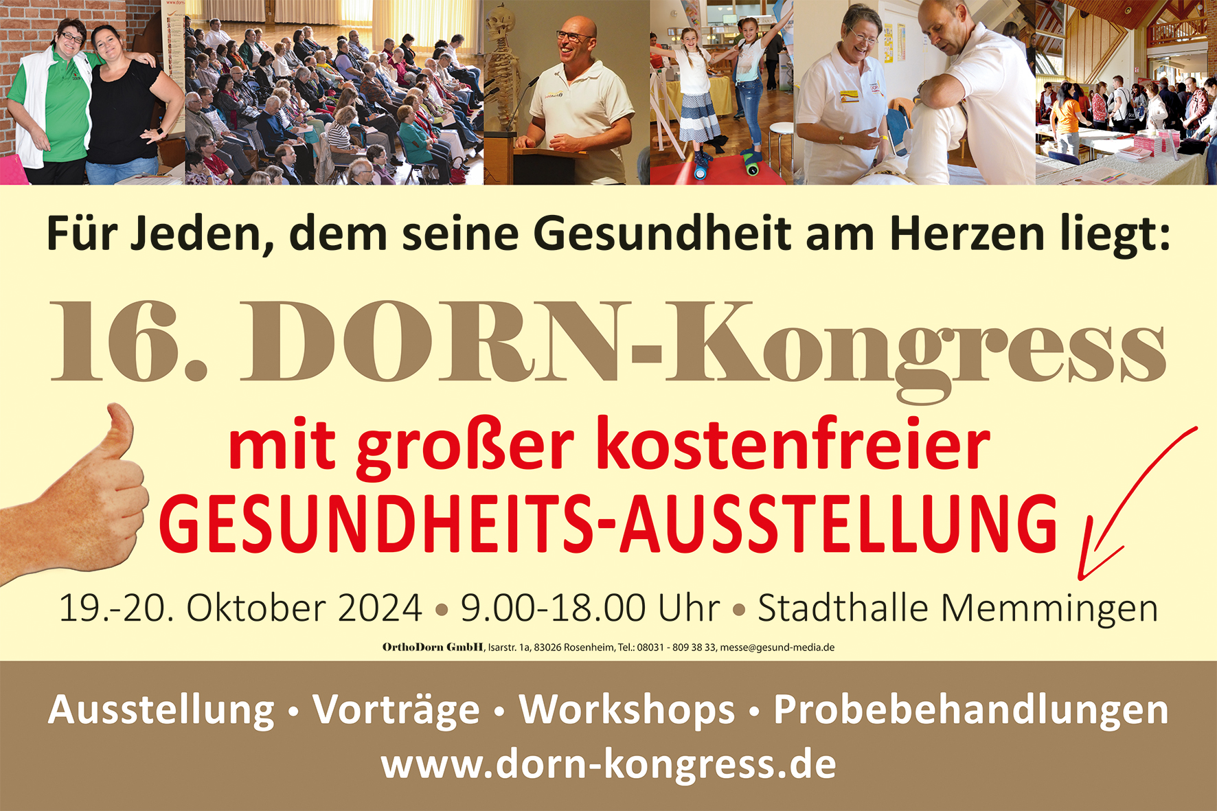 Ja, Sie haben richtig gelesen: ein Kongress für JEDEN! Denn auch die DORN-Anwendung sollte für jeden sein – sowohl als Schmerzbetroffener, als auch als Anwender. Deswegen ist unser DORN-Kongress auch für jeden zugänglich und verständlich organisiert. In unserer kostenfrei zugänglichen Gesundheits-Ausstellung kann sich jeder informieren. Zusätzlich bieten wir insgesamt 13 Vorträge und 36 Workshops rund um das Thema DORN und Rückengesundheit. Sogar ein kompletter 4-teiliger Workshop zum Erlernen der DORN-Anwendung ist dabei! Sie können also ohne Fachwissen oder Vorkenntnisse an einigen unserer Workshops teilnehmen und sich davon überzeugen lassen, wie einfach es sein kann sich und seinen Lieben bei Rücken- und Gelenkproblemen – aber auch bei anderen Beschwerden – helfen zu können! DORN ist und bleibt was es ist: so einfach wie genial und die nötige Hilfe zur Selbsthilfe. Deswegen ist uns der Kongress auch so wichtig – hier bleibt DORN was es ist und wie es im Sinne von Dieter Dorn gelehrt wurde.