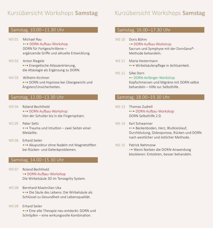 Dieses Jahr bieten wir fünf extra DORN-Aufbau-Workshops an. Diese sind extra für DORN-Anwender und Experten gedacht, welche ihre Fertigkeiten noch verfeinern und/oder erweitern wollen. DORN-Aufbau-Workshops am Samstag: WS 01, WS 04, WS 07, WS10 und WS 13, im Folgenden ROT markiert. - DORN-Schnupperkurs:
