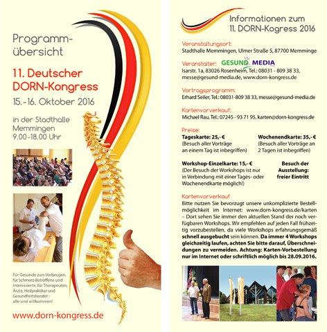 Auch Sie können den DORN-Kongress auf einfache Art und Weise unterstützen. Gerne senden wir Ihnen Werbematerialien wie Programmhefte, Flyer, Banner oder Aufkleber zu. Diese können Sie auslegen, verteilen oder verschicken. Umgekehrt hinterlassen die Werbemaßnahmen einen seriösen und professionellen Eindruck bei Ihren Patienten und Kunden. Natürlich erhalten Sie die Werbemittel kostenfrei von der Gesund Media GmbH.