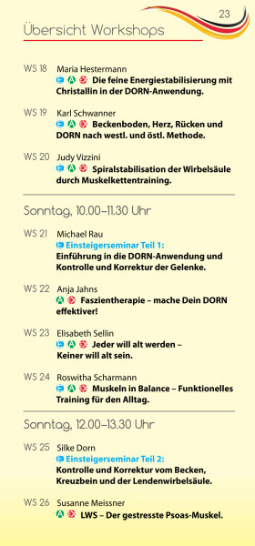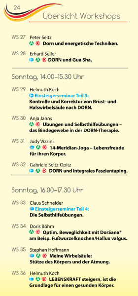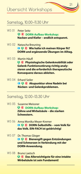 Dieses Jahr bieten wir fünf extra DORN-Aufbau-Workshops an. Diese sind extra für DORN-Anwender und Experten gedacht, welche ihre Fertigkeiten noch verfeinern und/oder erweitern wollen. DORN-Aufbau-Workshops 2017: WS 01, WS 05, WS 09, WS13 und WS 17, im Folgenden GRÜN markiert.