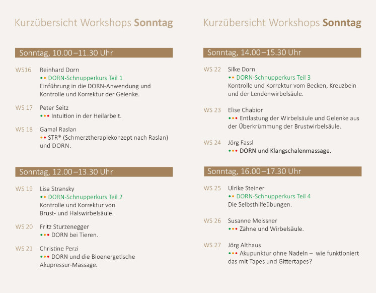 Wir bieten eine Reihe von vier aufeinanderfolgenden Workshops zum Kennenlernen und Ausüben der DORN-Anwendung an. Hierfür buchen Sie bitte die DORN-Schnupperkurse Teil 1–4 (WS 16, WS 19, WS 22 und WS 25) am Sonntag im Folgenden GRÜN markiert.